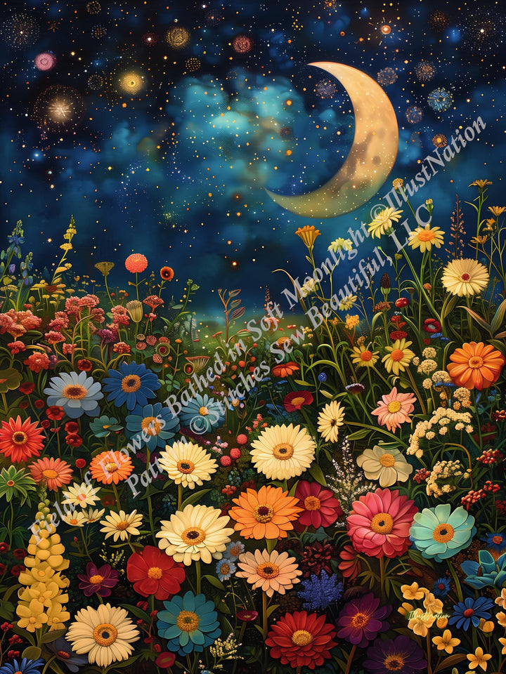Field of Flowers Bathed in Soft Moonlight counted cross stitch pattern by IllustNation