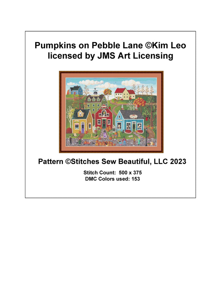 Pumpkins on Pebble Lane cross stitch pattern by Kim Leo licensed by JMS Art Licensing