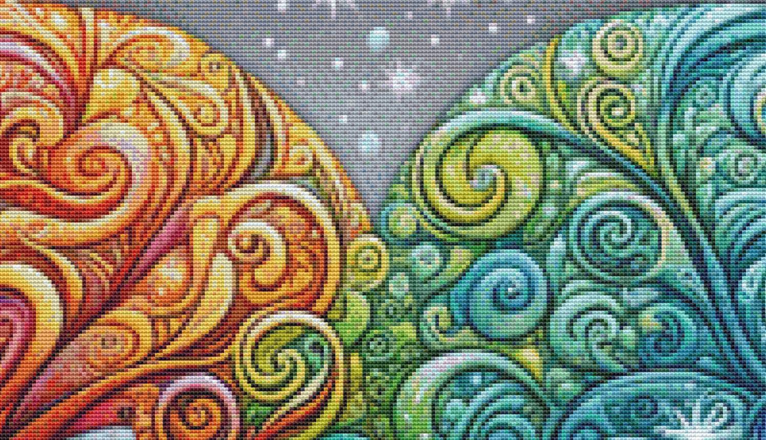 "A Colorful Winter Wonderland" full coverage counted cross stitch pattern.