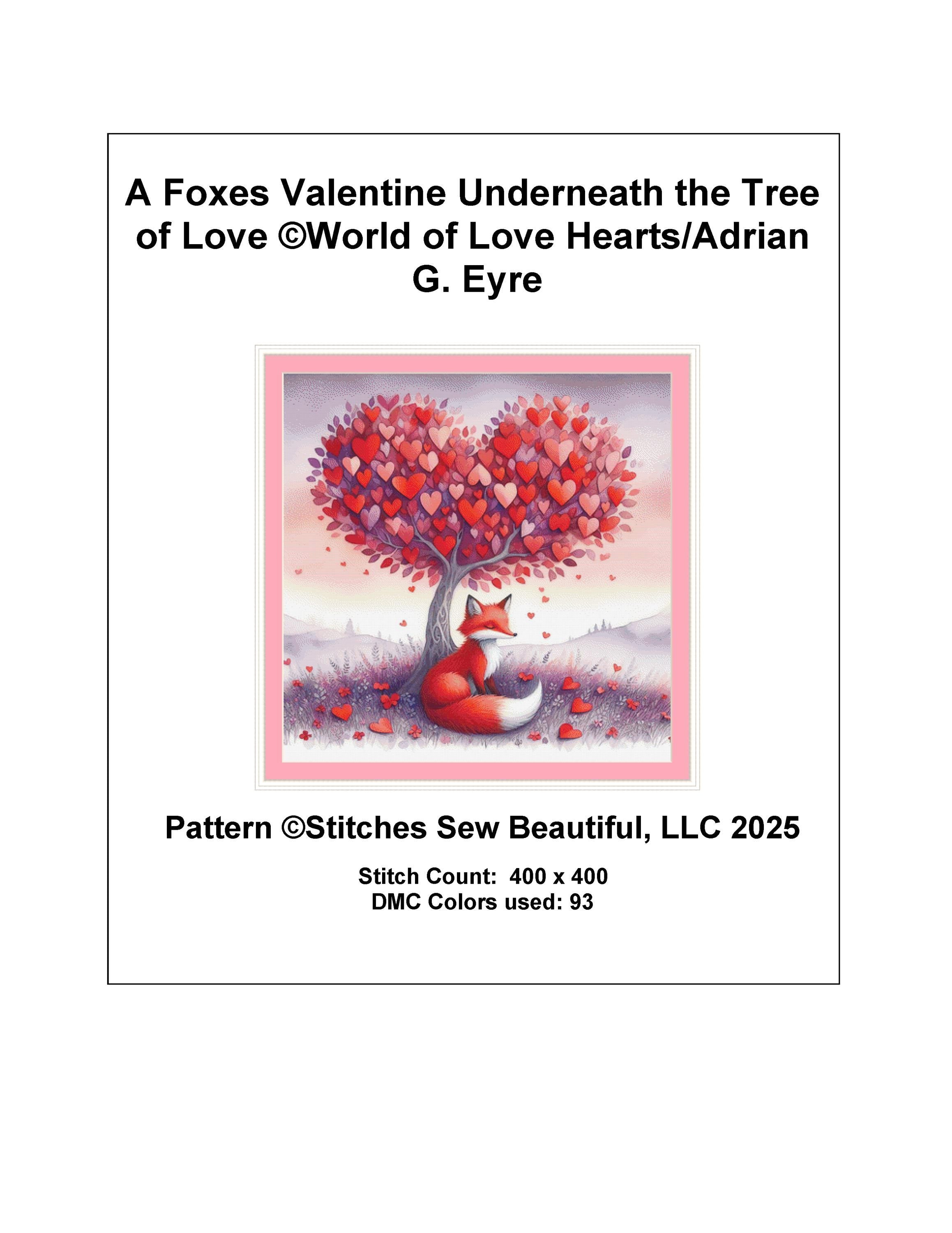 "A Foxes Valentine Underneath the Tree of Love" full coverage counted cross stitch pattern.