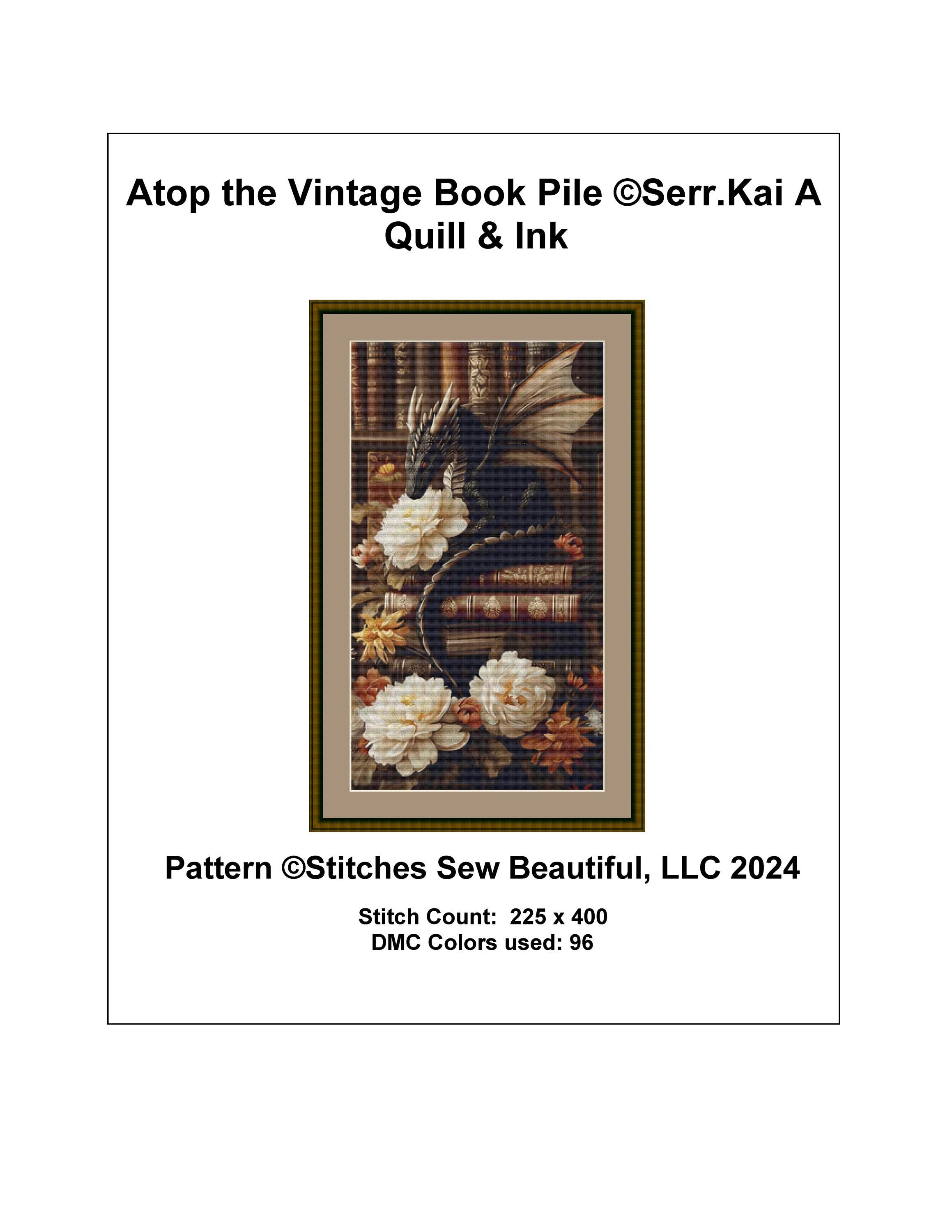 Atop the Vintage Book Pile counted cross stitch pattern by Serr.Kai A Quill & Ink