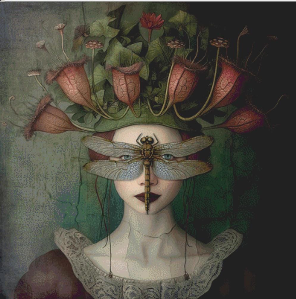 "Carnivorous Crown" full coverage counted cross stitch pattern.