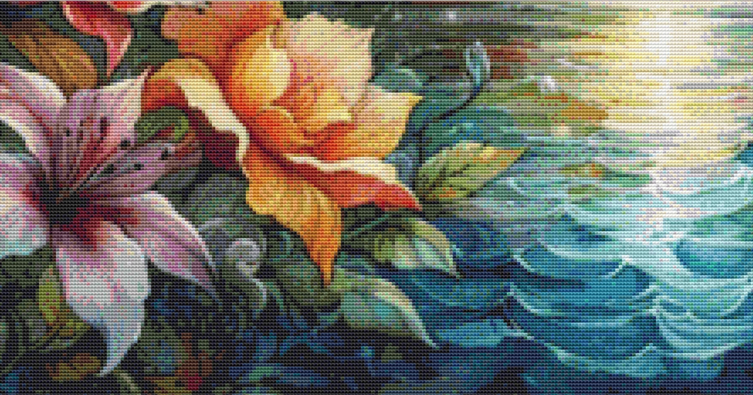 "Celestial Sky Over Moonlit Waves" full coverage counted cross stitch pattern.