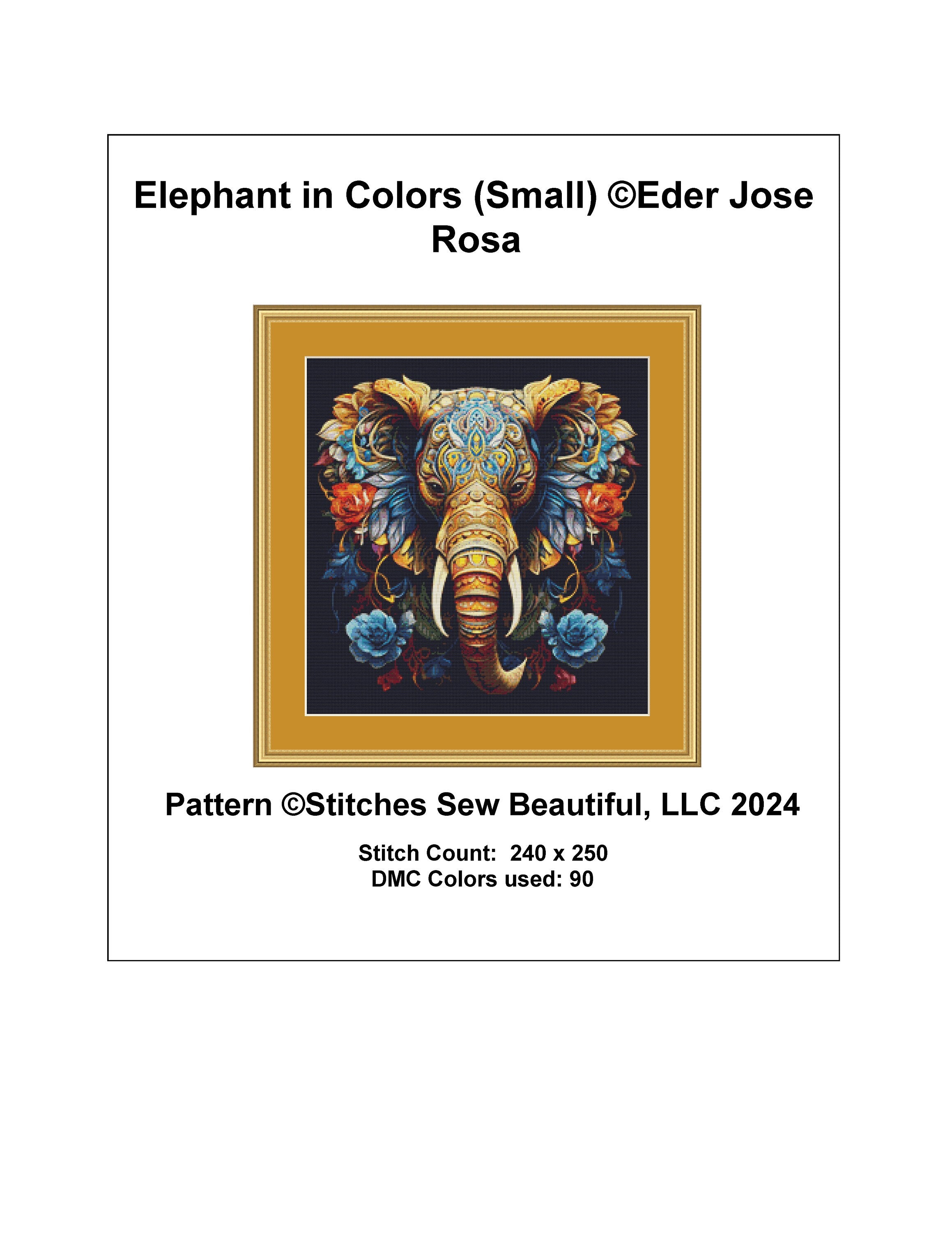 "Elephant in Colors" (Small) full coverage counted cross stitch pattern.
