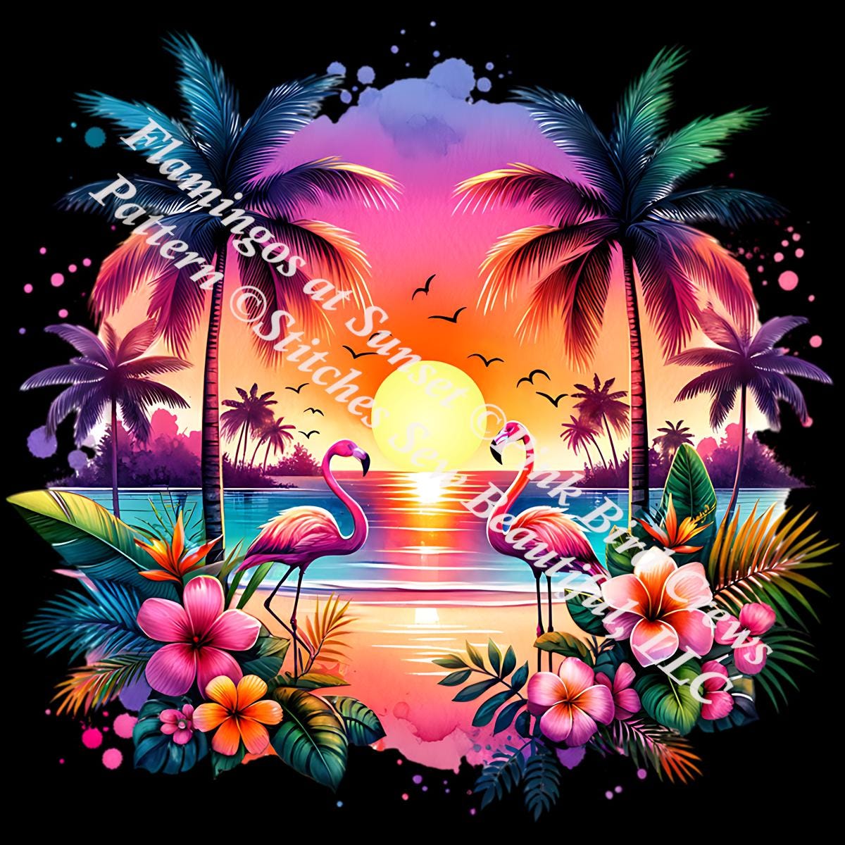 "Flamingos at Sunset" full coverage counted cross stitch pattern.