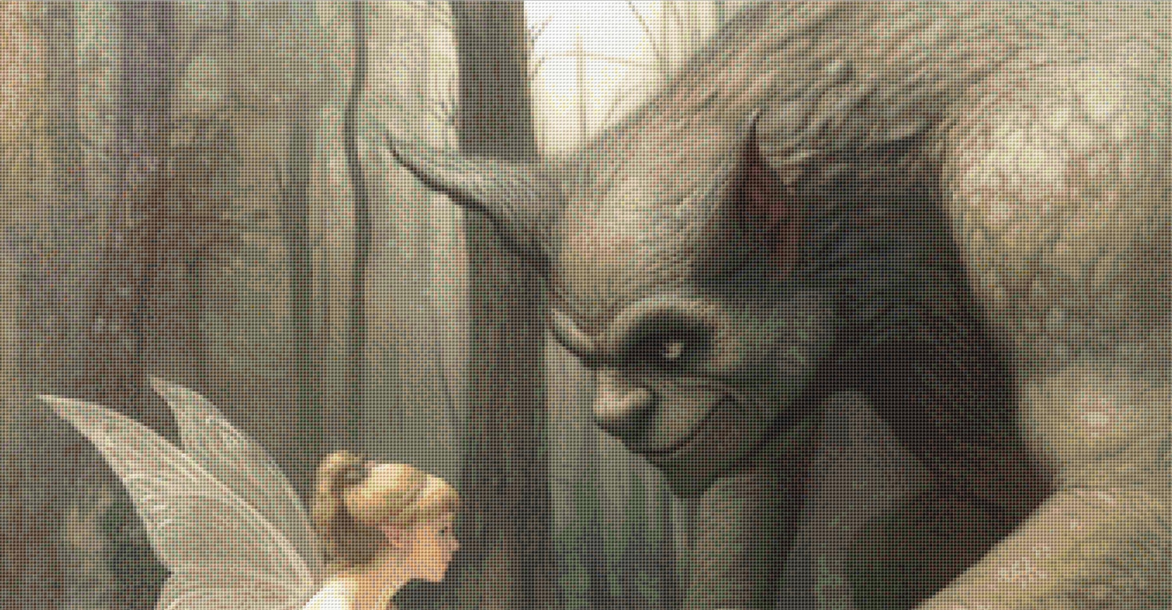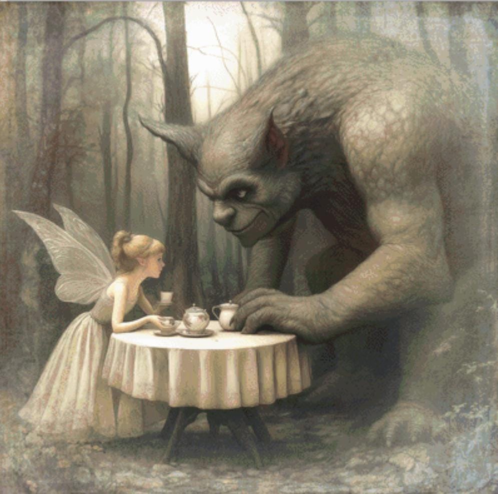 "Forest Folk at Tea" full coverage counted cross stitch pattern.