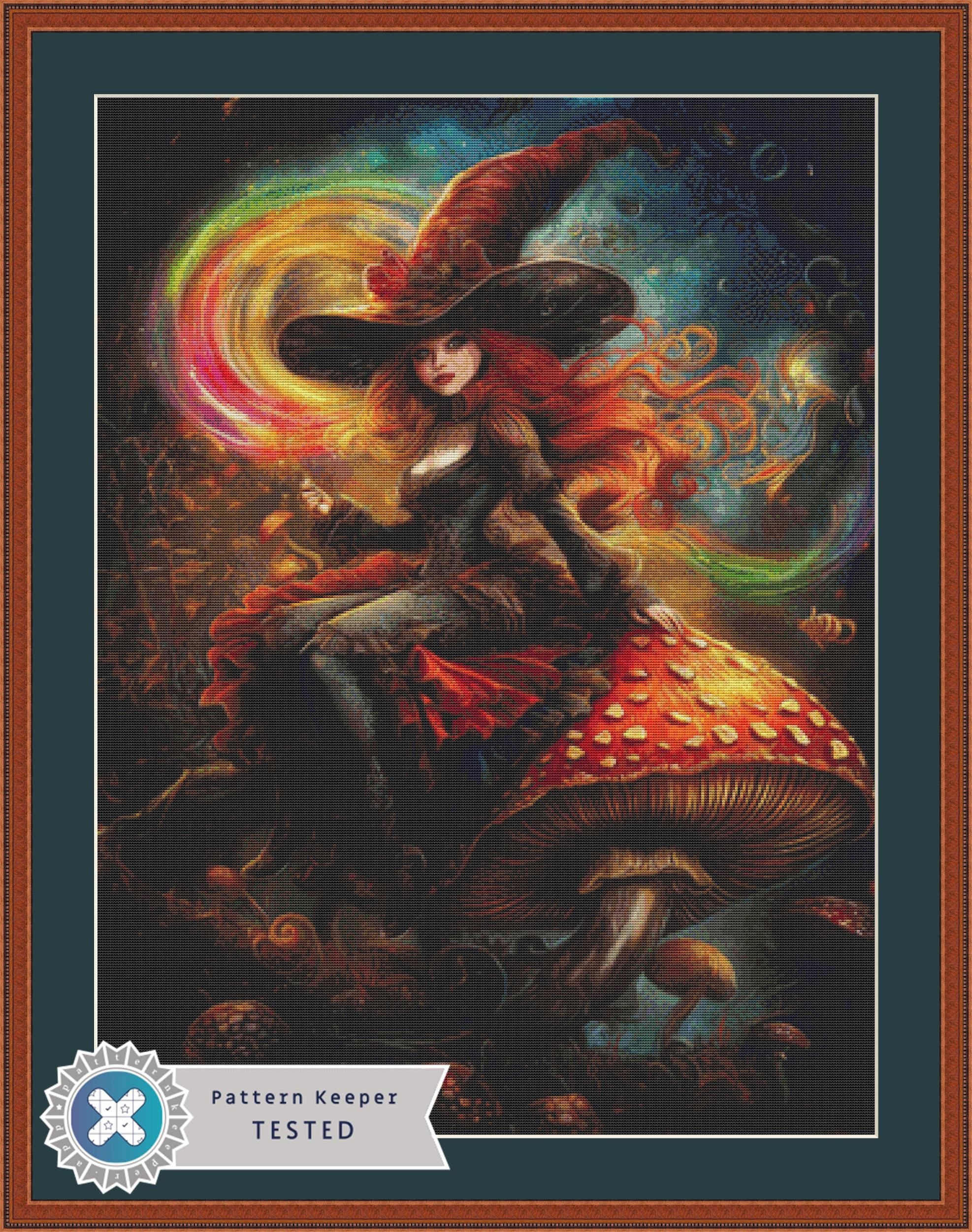 "Mushroom Spells" full coverage counted cross stitch pattern.