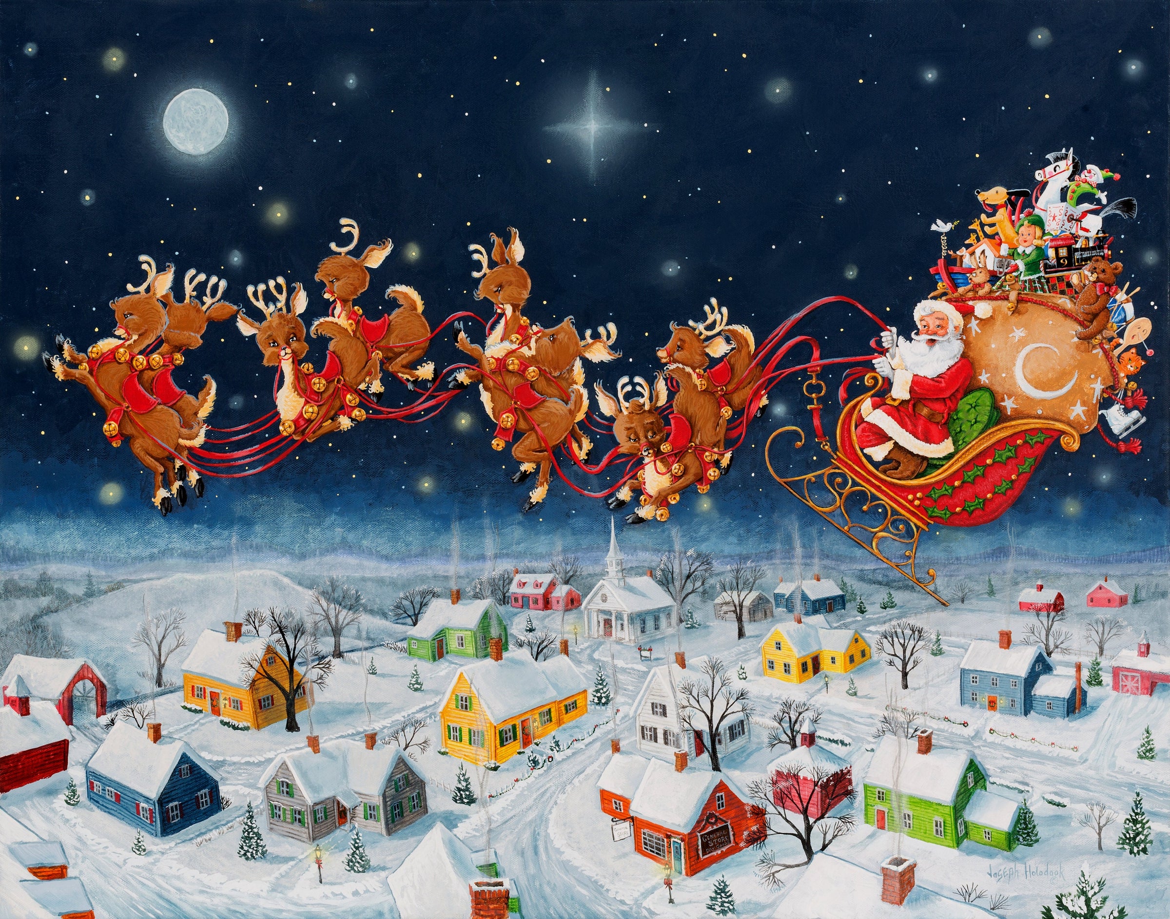 "Now Dash Away All" full coverage cross stitch pattern by Joseph Holodook/Porterfields Fine Art Licensing.