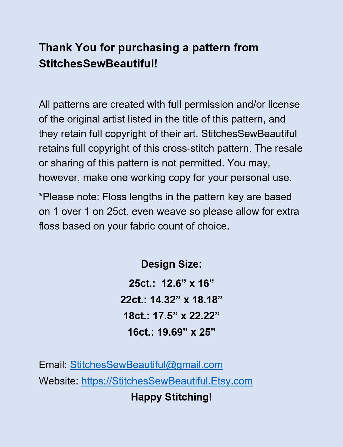 Stitch count: 315 x 400, 125 DMC colors. Digital Format.
