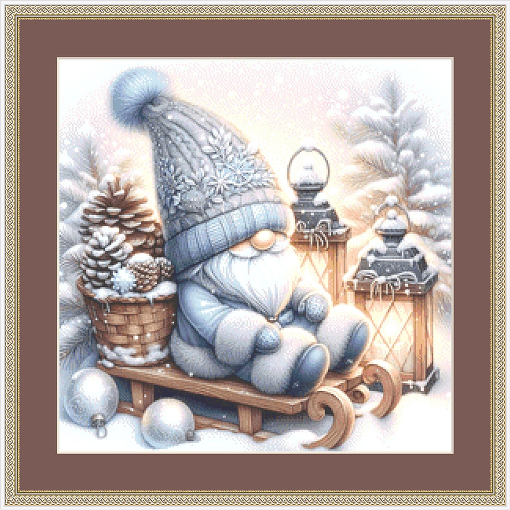 "Sleighride Gnome" (Small) full coverage counted cross stitch pattern.