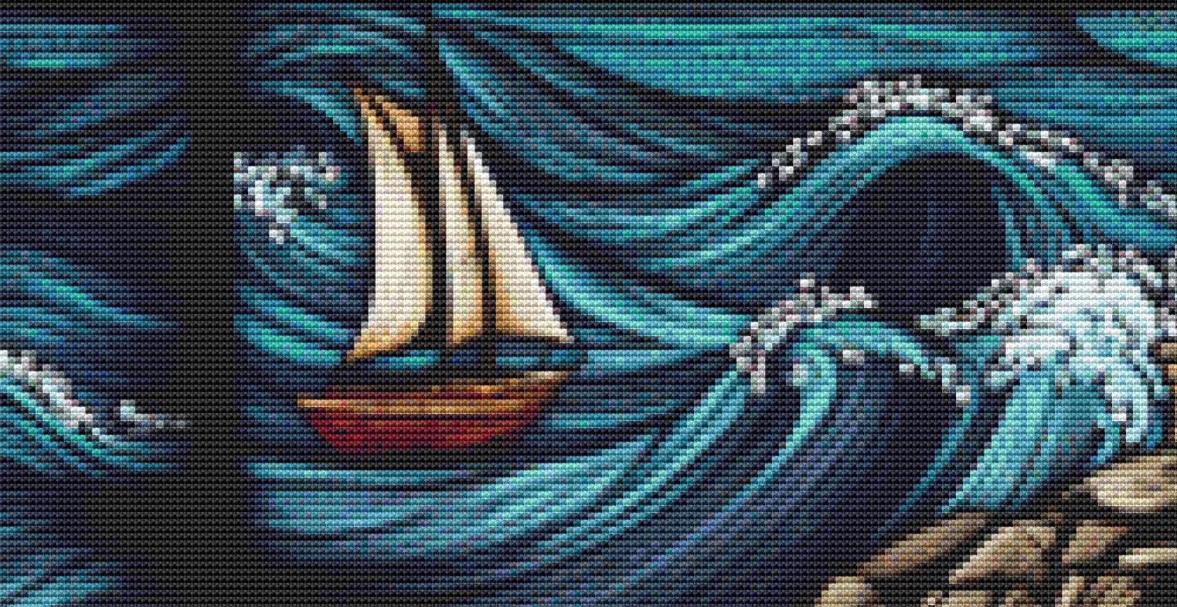 "Stained Glass Light House" (Max Color) full coverage counted cross stitch pattern.