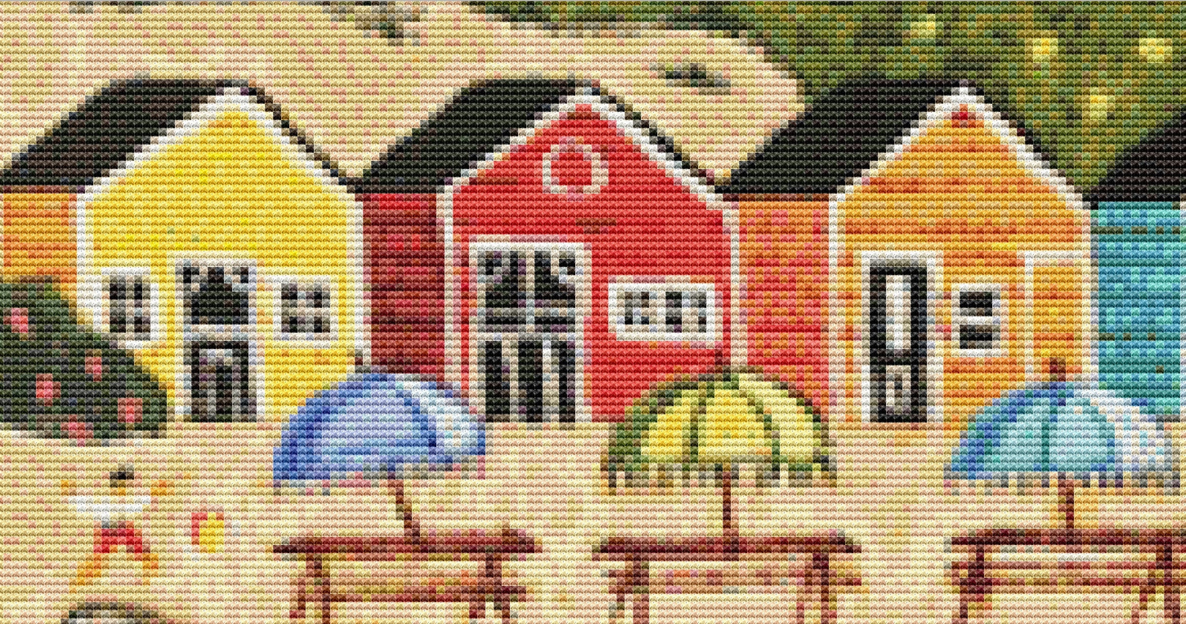 "Summer Cottages" full coverage cross stitch pattern by Patrick Gauthier.
