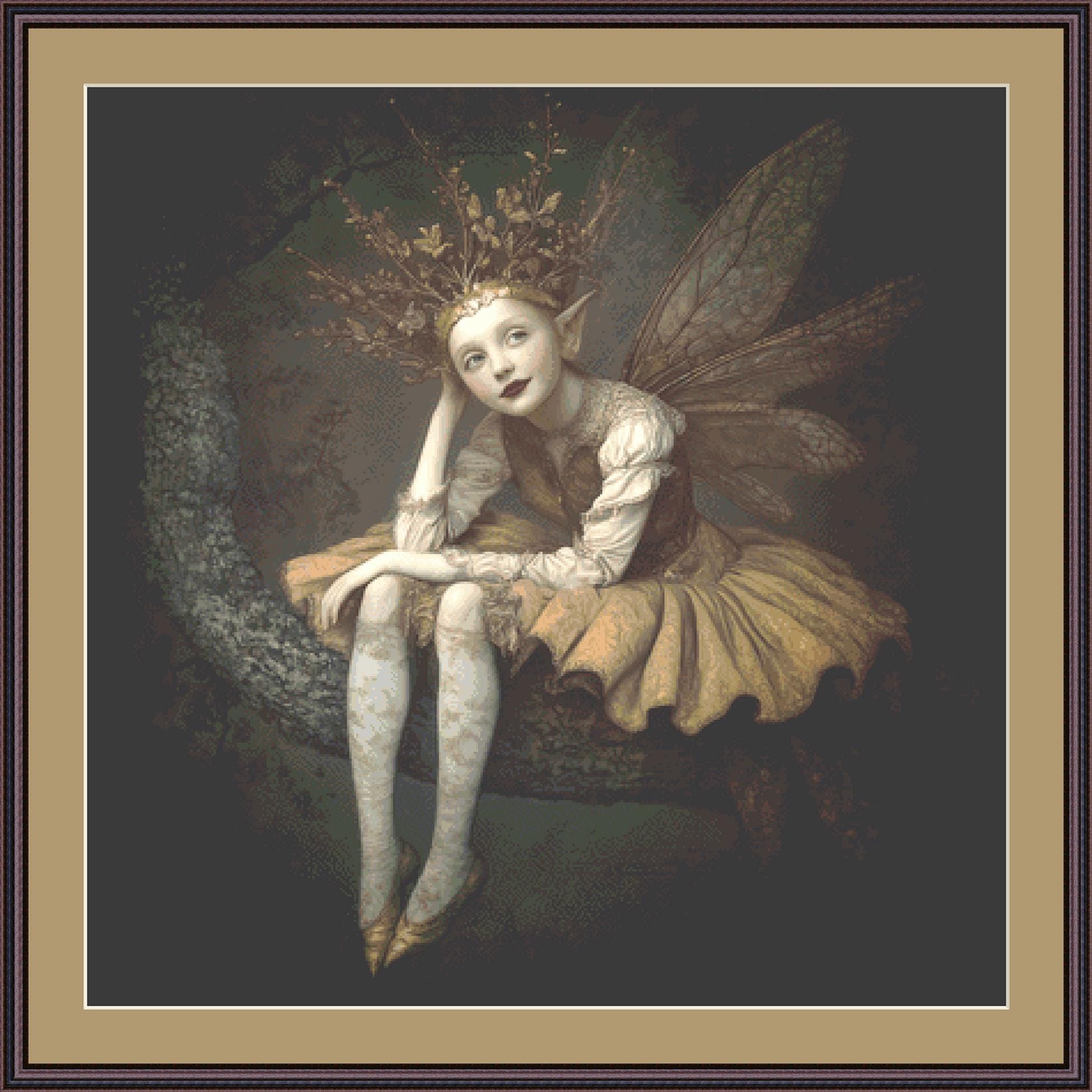 "Treetop Fairy" full coverage counted cross stitch pattern.
