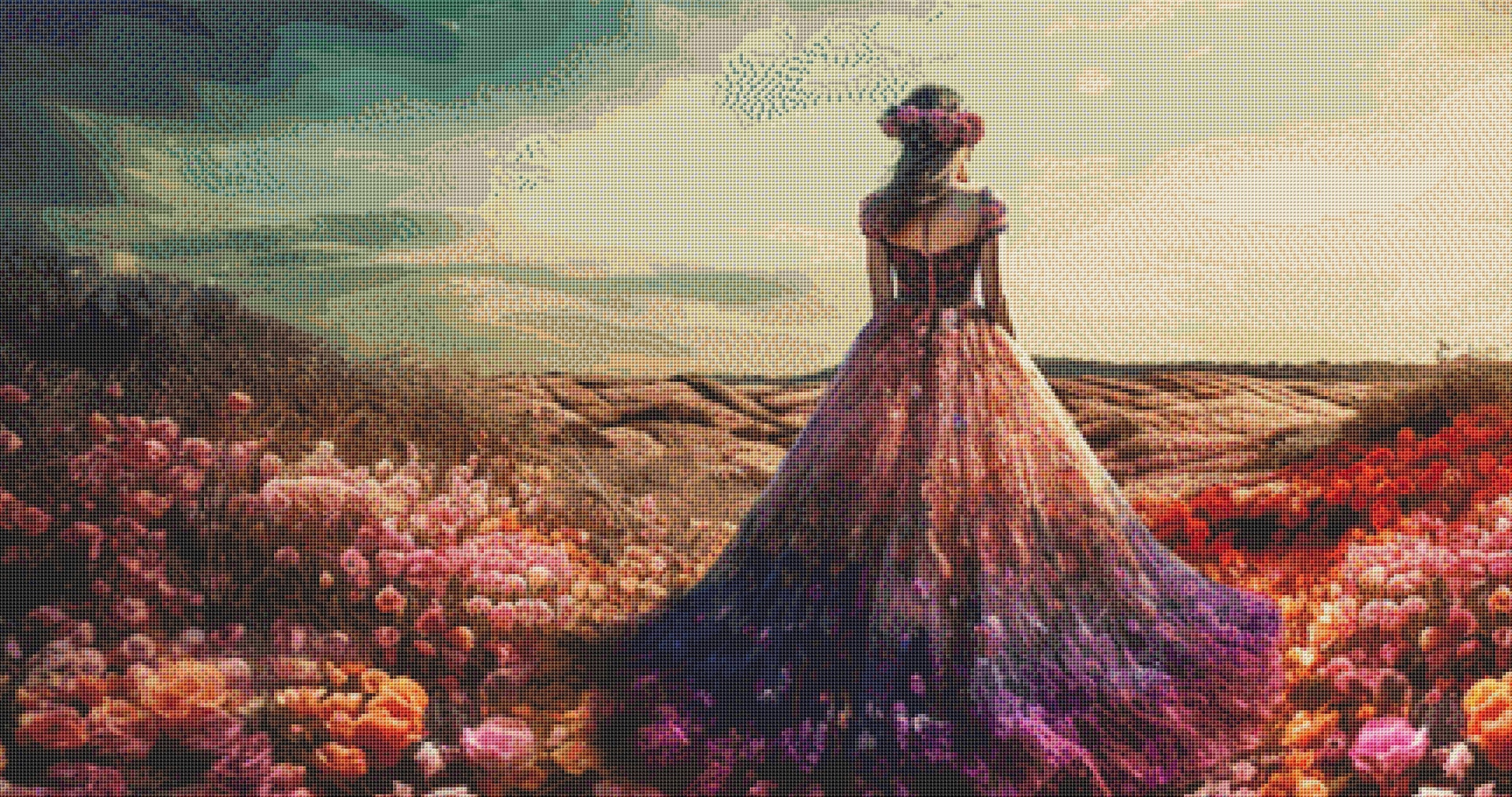 "Woman in a Field of Flowers 3" full coverage cross stitch pattern by Eder Jose Rosa.